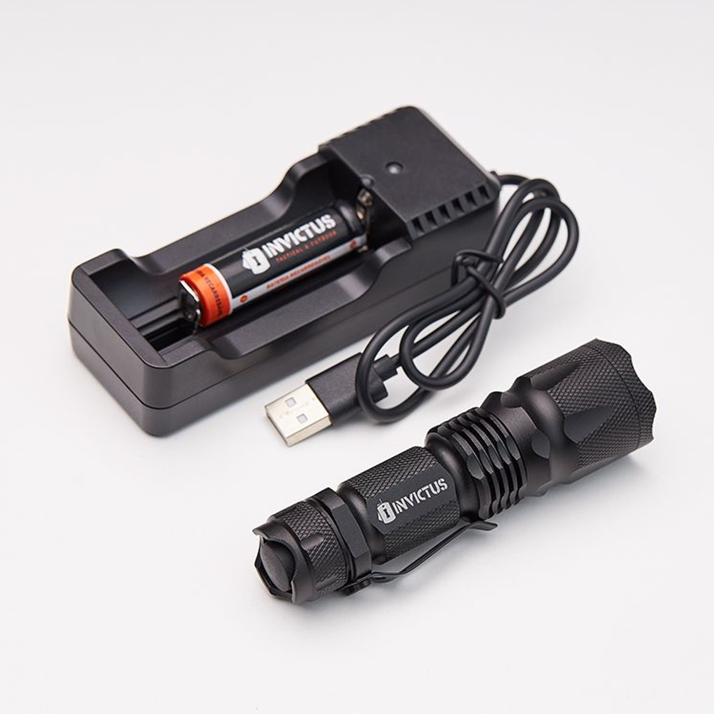 - Incluí carregador USB e Bateria Recarregável INVICTUS 14500.