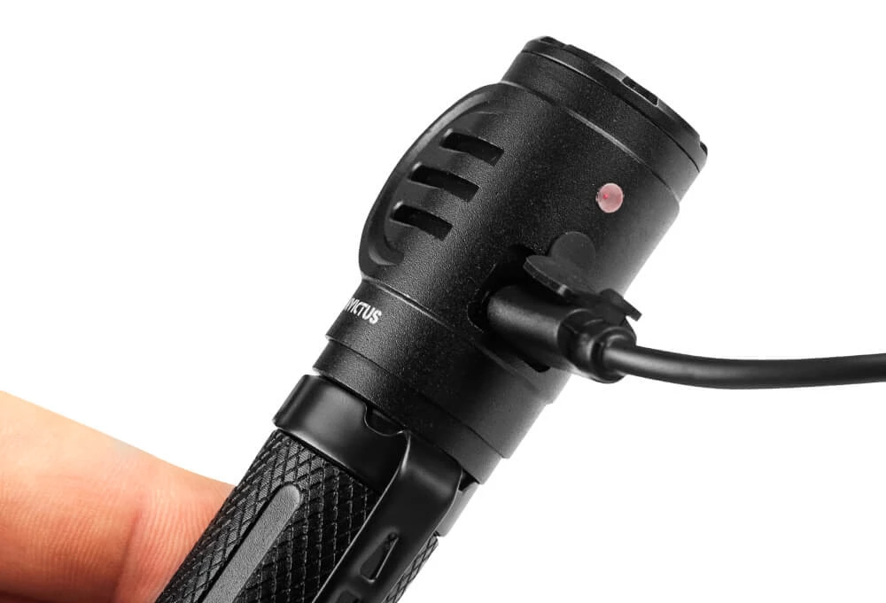 - Carregamento via porta USB lateral com indicador de carga.
