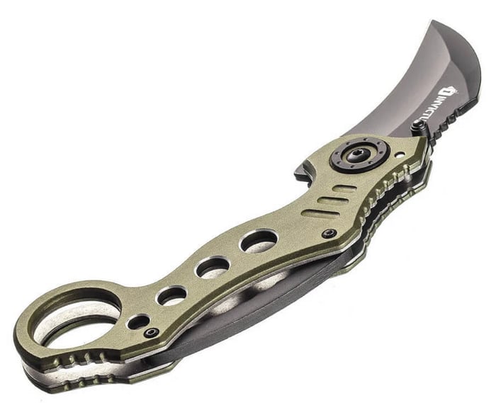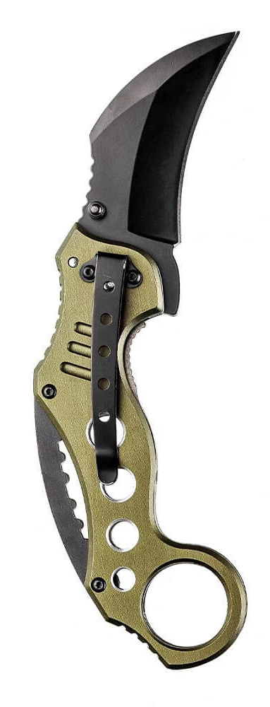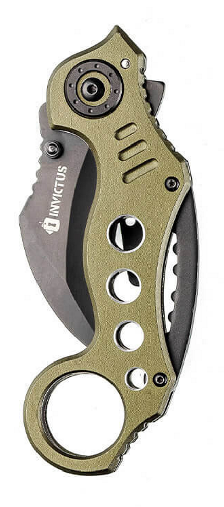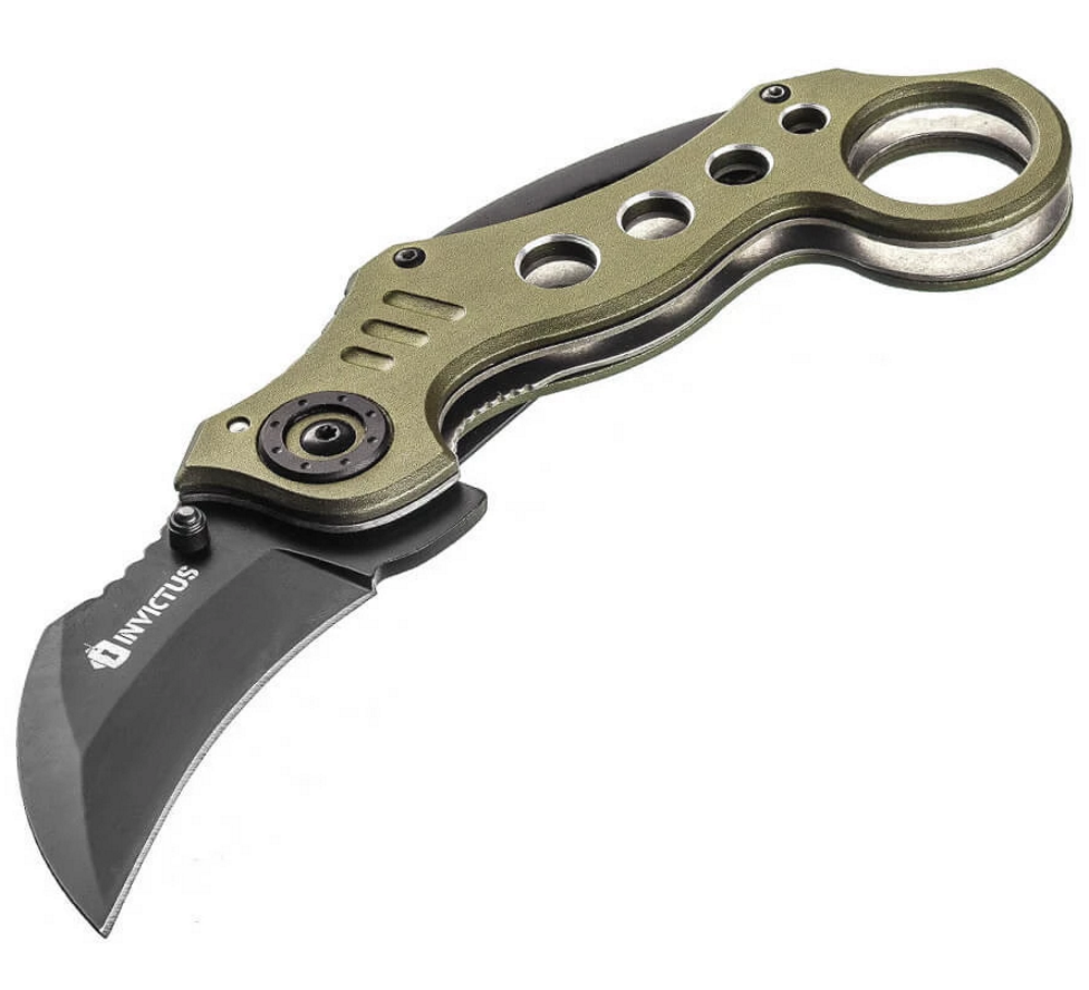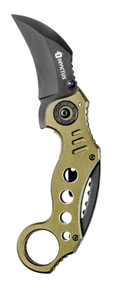 O canivete Shark Green compõe o portfólio de canivetes táticos INVICTUS. Estilo Karambit, seu design valoriza a ergonomia. Possui lâmina em aço inoxidável 420, cabo em alumínio, clip tático e abertura rápida assistida por mola (spring assisted).