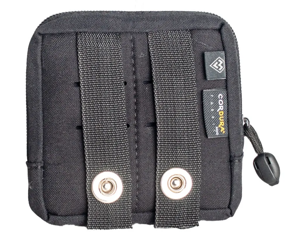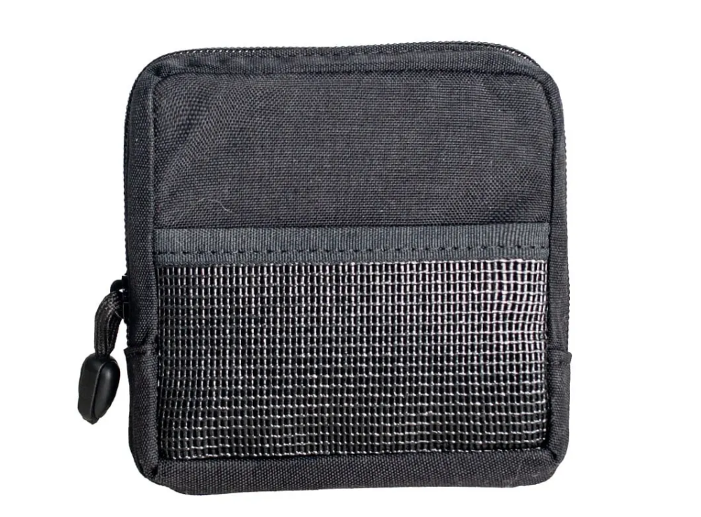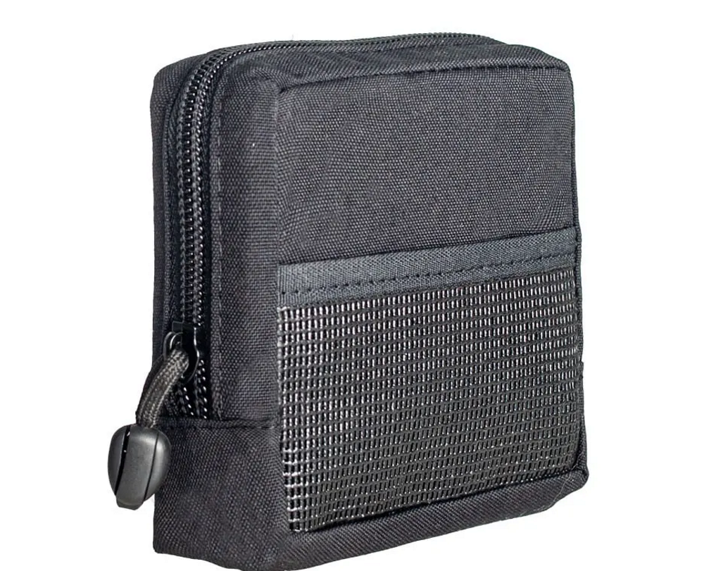 Bolso pequeno com espaço adicional frontal em tela resistente para se colocar objetos que se precise retirar rapidamente como cadernetas de anotação.