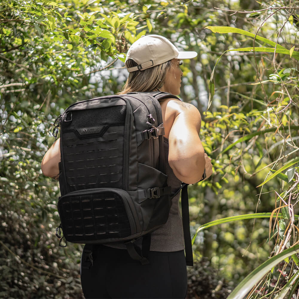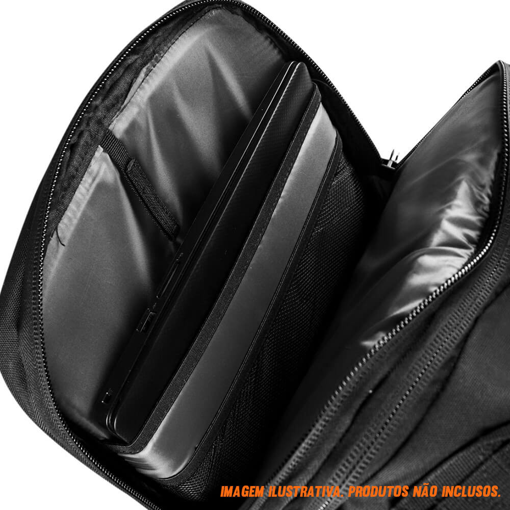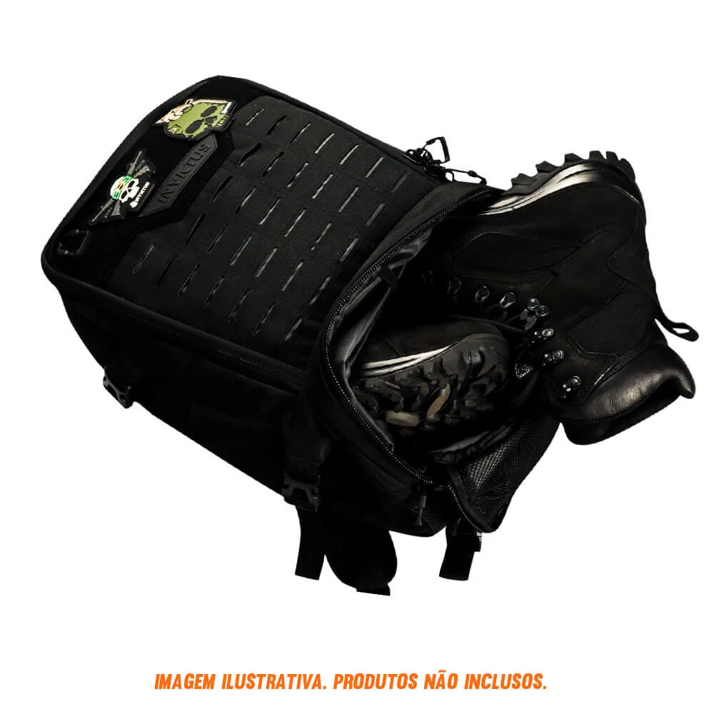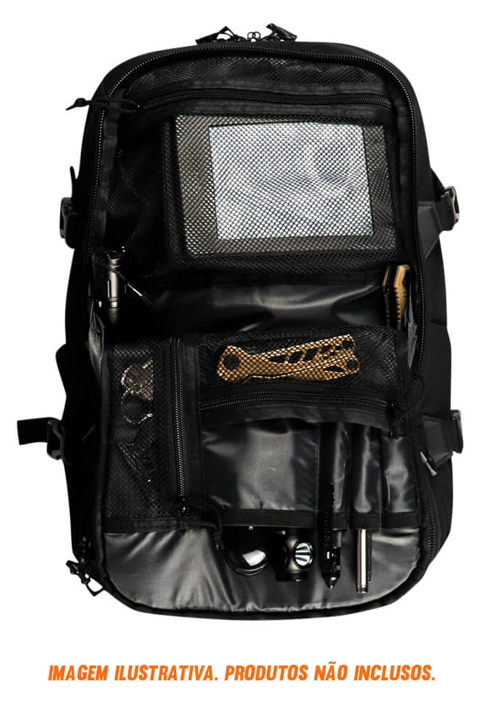 Fabricada em tecido poliéster 1000 D resinado em PVC, ela é resistente à água, possui painel frontal com sistema MOLLE Laser Cut dublado e 7 compartimentos com múltiplos bolsos, além de tecido aderente para fixação de patches. Ainda, ela conta com zíperes duplos com puxador anatômico, bolso frontal porta-óculos.