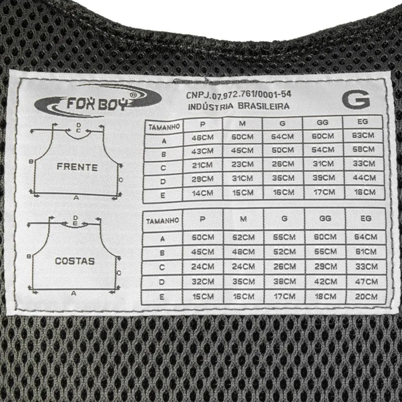 - Possui velcros para inserção de identificações na parte frontal e dorsal.
