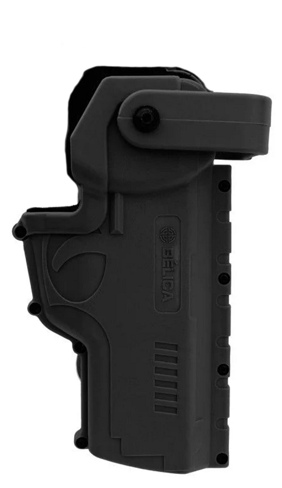 - Possui catraca rotativa, permitindo a angulação do Coldre em sua base, facilitando o manuseio;