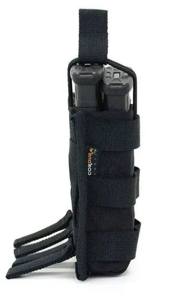 Confeccionado em Cordura® 1000 DENIER, elásticos de 3,5 mm de espessura e puxador em fita de 2,5cm 100% poliamida dobrada ao elástico como puxador do sistema de pressão sobre o(s) carregador(es).