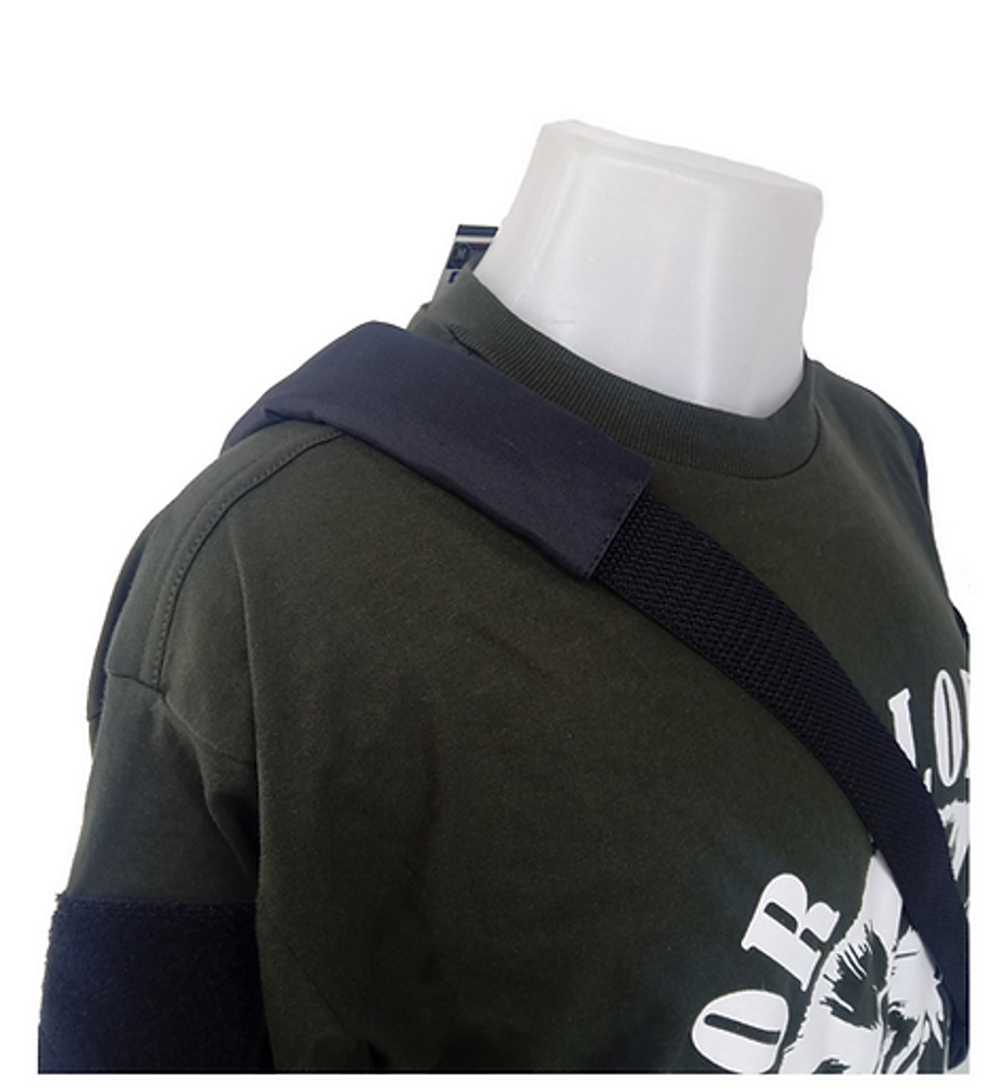 O conjunto possui reguladores retangulares de medida em polímero, nas duas extremidades. A bandoleira dispõe costuras reforçadas com fio de alta performance e uma peça semi circular em polímero que atua como direcionador de angulação evitando que o conjunto fique torcido durante a operação.
