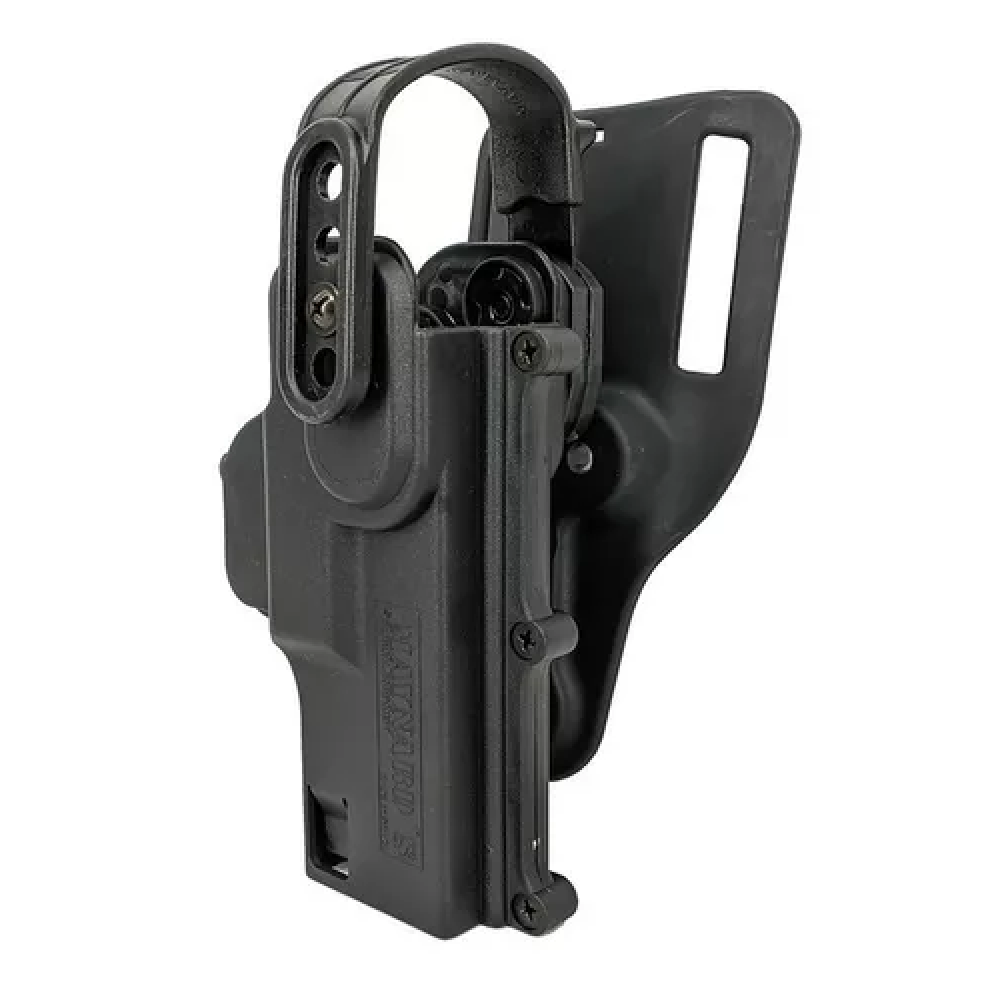Coldre de cintura produzido em polímero, com sistema de adaptadores para diversos modelos de armas em uso pelas forças armadas do Brasil.