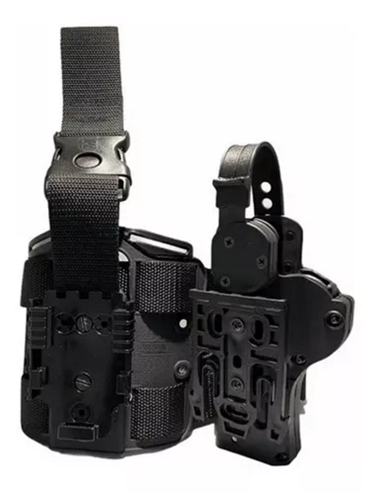 - Porta carregador duplo sem tampa, com passagem para cinto tático, compatível com todos os carregadores