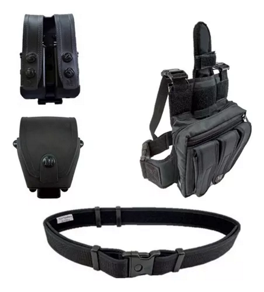 - Possui dois bolsos com fechamento em zíper e três porta carregadores frontais com fechamento em velcro