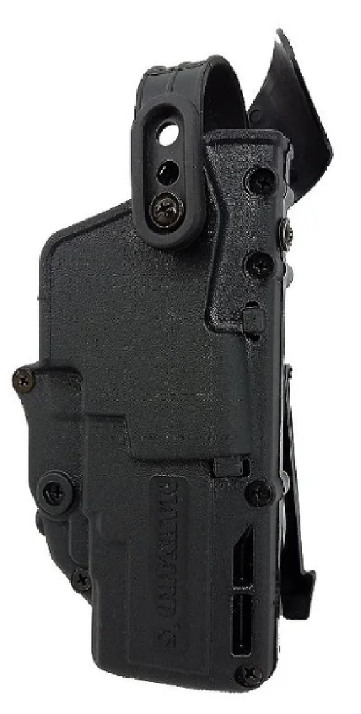 Possuindo a Tripla retenção com destravamento via alavanca acionada pelo polegar. Retenção do Tombreik liberando para saque do coldre, e retenção passiva por regulagem de pressão do tensor via parafusoacessada abaixo do coldre.
