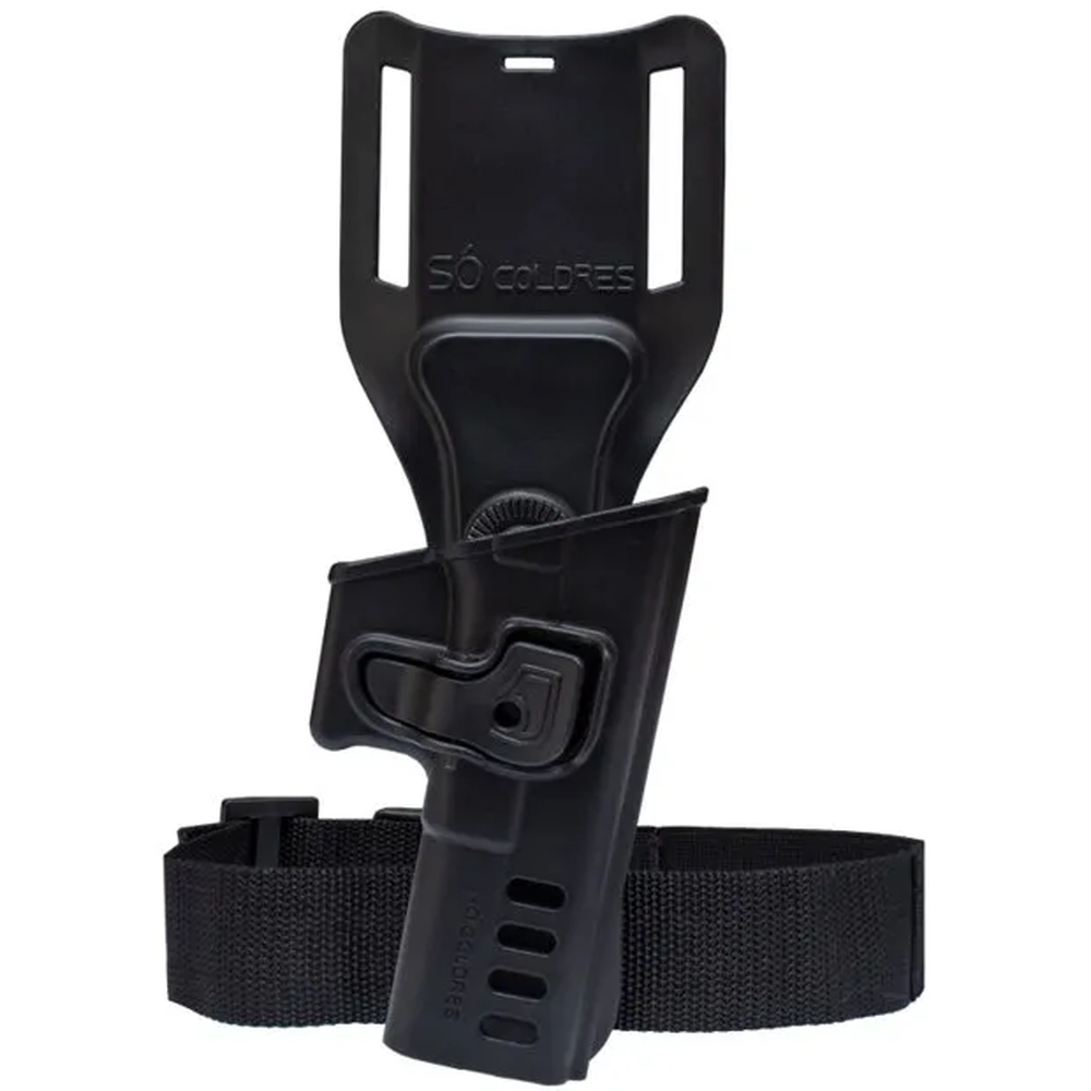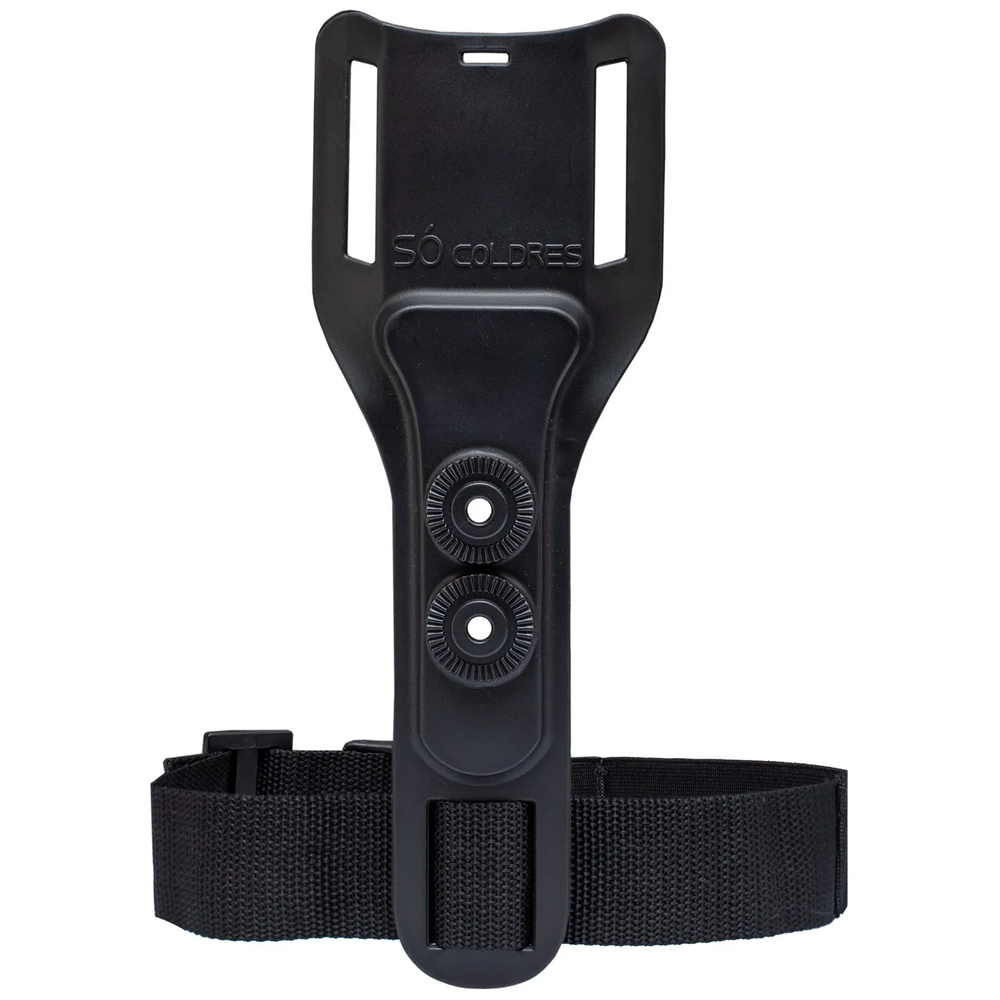 Suporte meio termo usado para deixar o coldre mais abaixo da linha da cintura, escapando do colete tático, vem com uma tira para prender na perna e dar mais firmeza ao caminhar.
