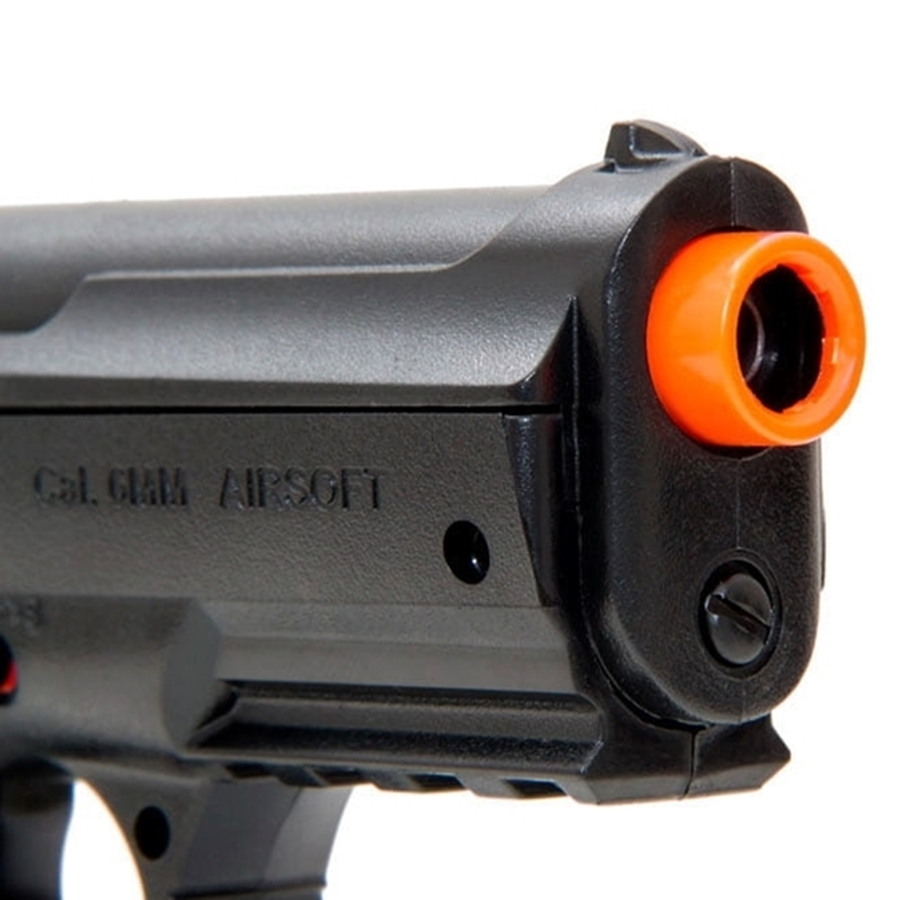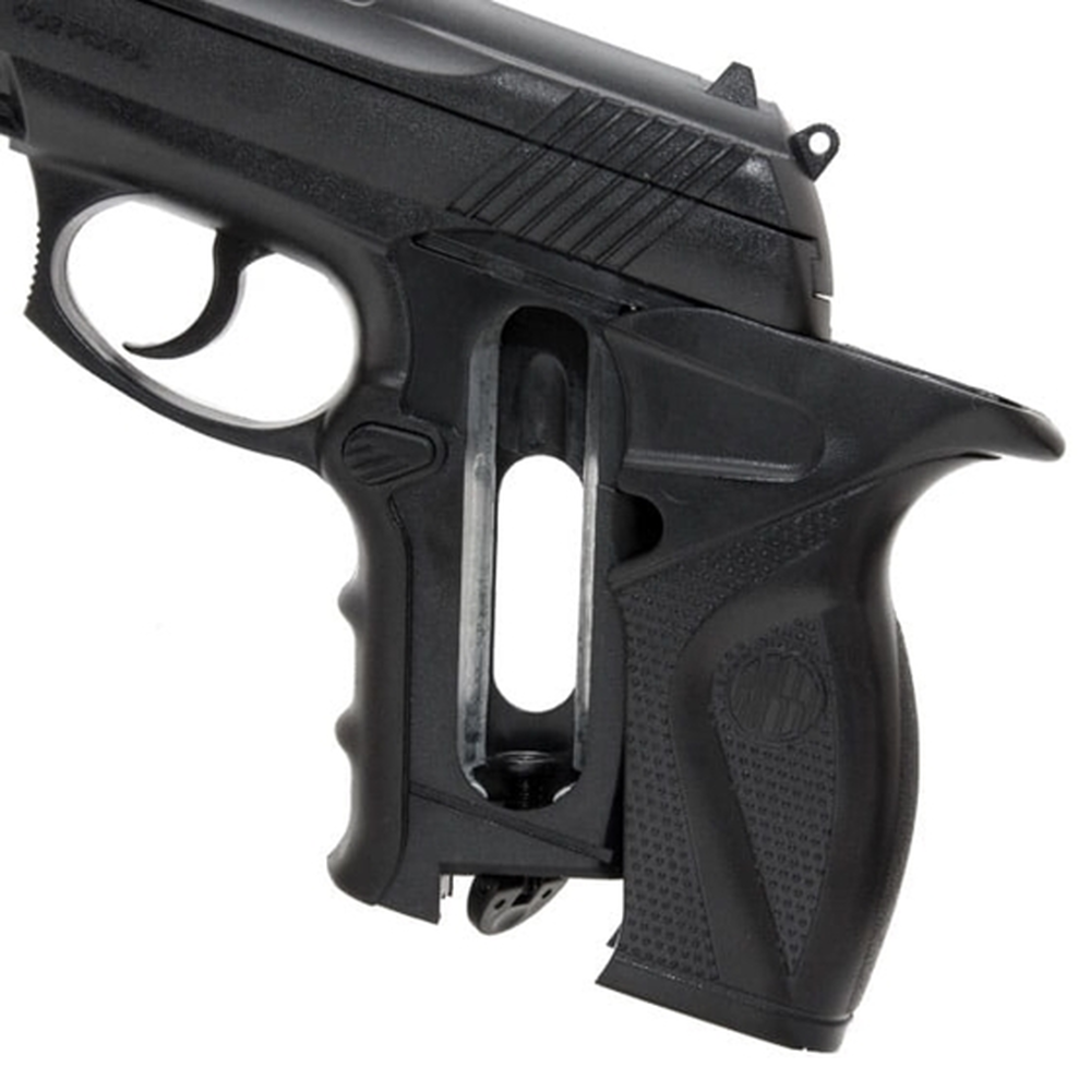- Seu funcionamento é a gás CO2 e os disparos contam com um realismo incrível. Para ter acesso ao cilindro de CO2, basta retirar o magazine e deslizar o grip para trás, onde se localizará dentro da empunhadura.