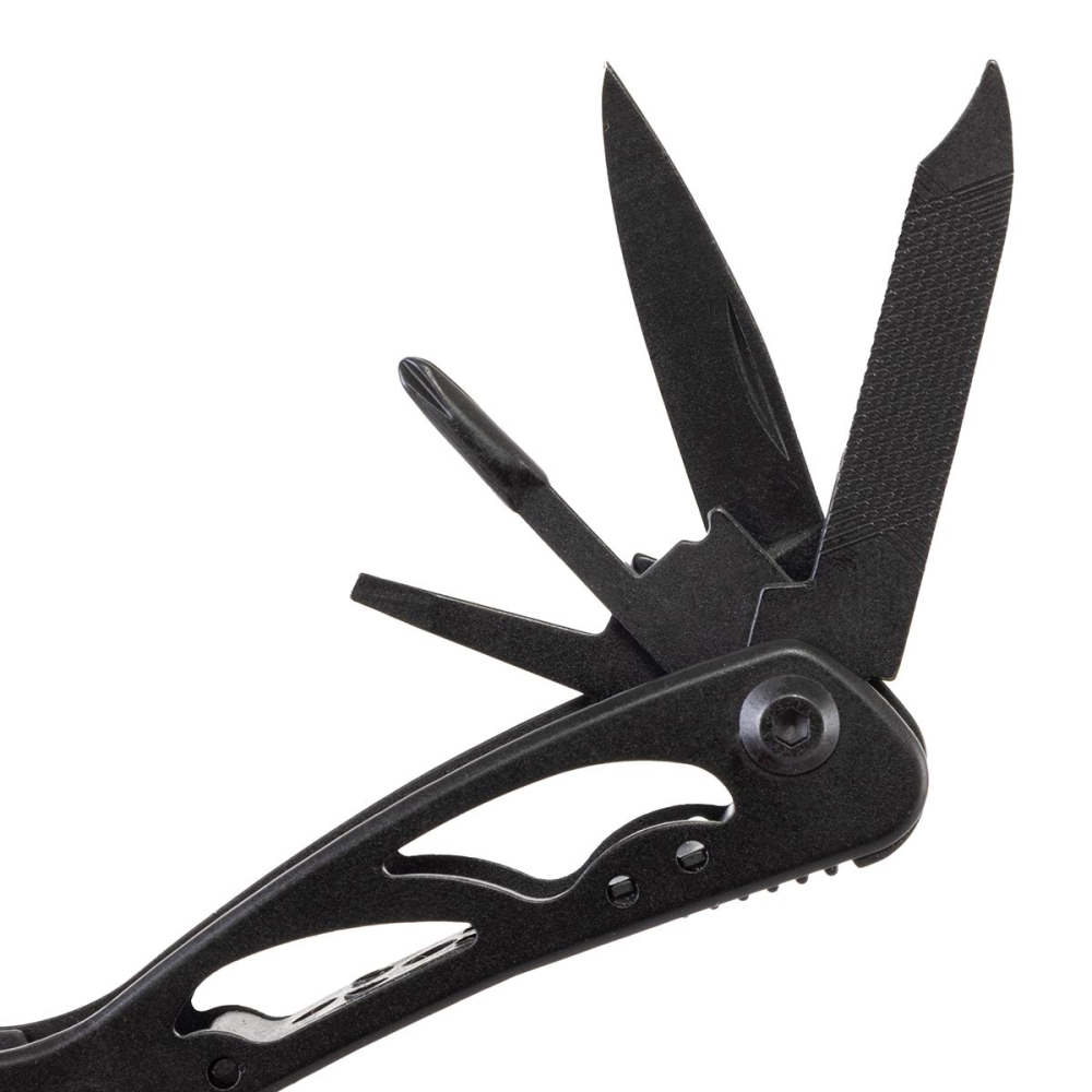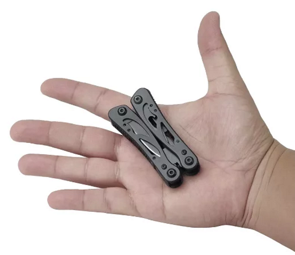 - 9 funções: alicate, faca, faca pequena, abridor de latas, chave de fenda grande, chave de fenda pequena, chave Philips, faca serrilhada e faca lima.