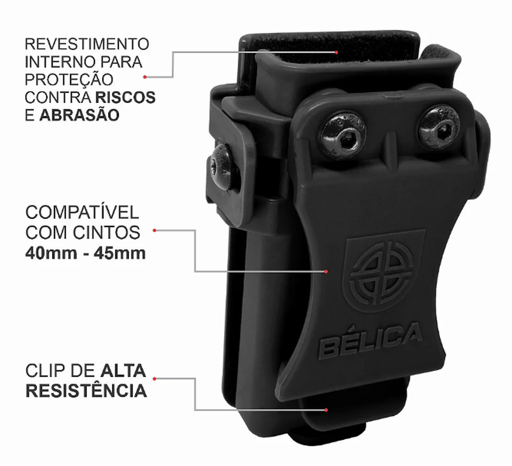 - Clip de alta resistência compatível com cintos 40mm e 45mm;