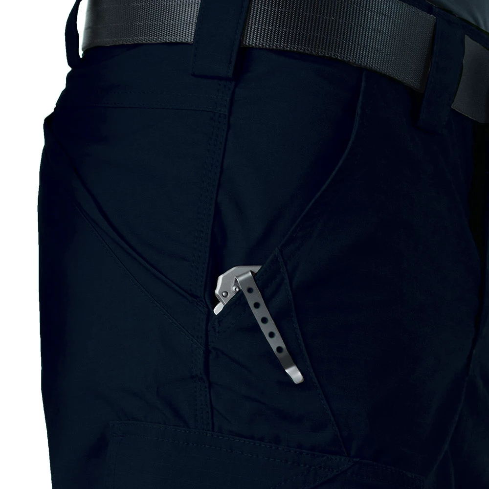 - Bolsos laterais deslocados para cima e levemente inclinados para facilitar o acesso, mesmo com de arma empunhada.