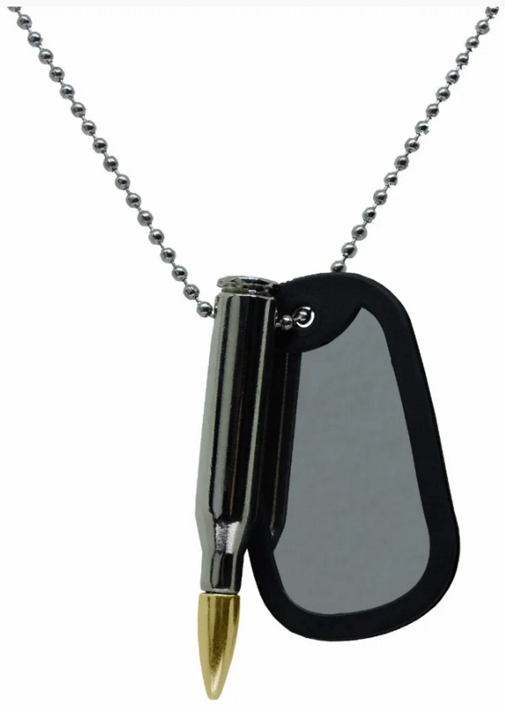 A Plaqueta vem com uma chapinhas lisa, onde você gravar seus dados mais importantes, e uma bala cromada.