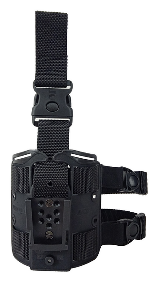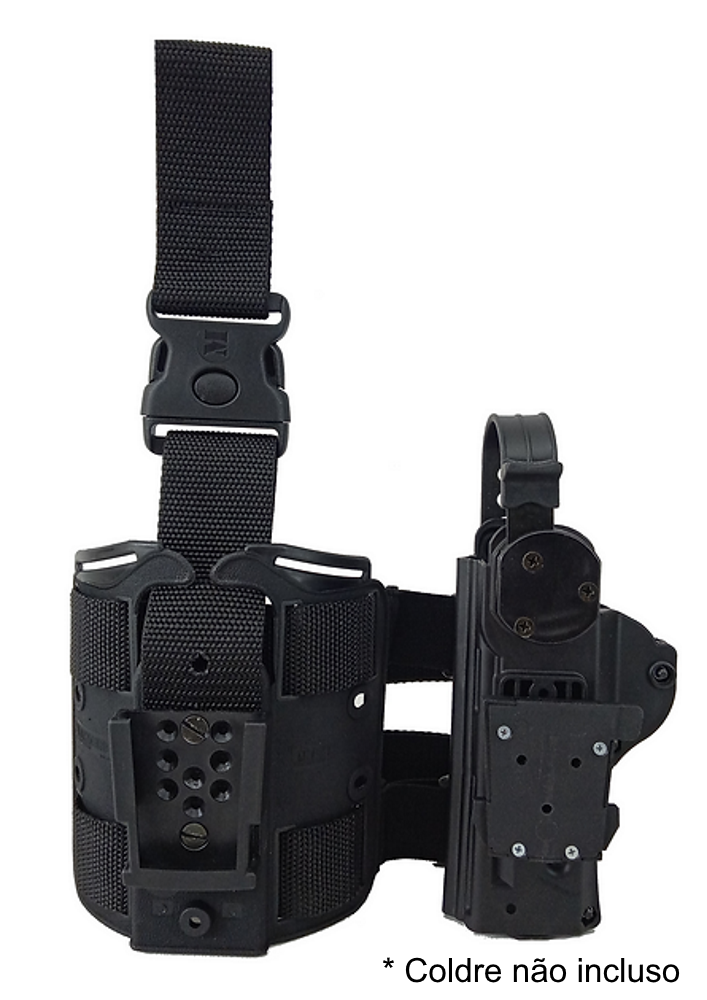 Plataforma de perna tipo "robocop" produzido em polímero, com sistema de acoplamento tipo catraca padrão Maynards. Compatível com coldres de catraca modelos MCC02 e MCC03.