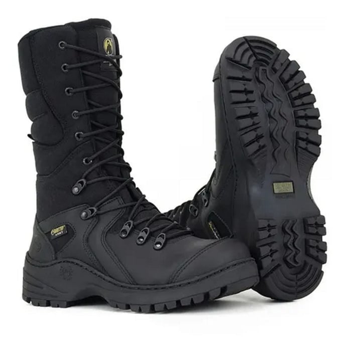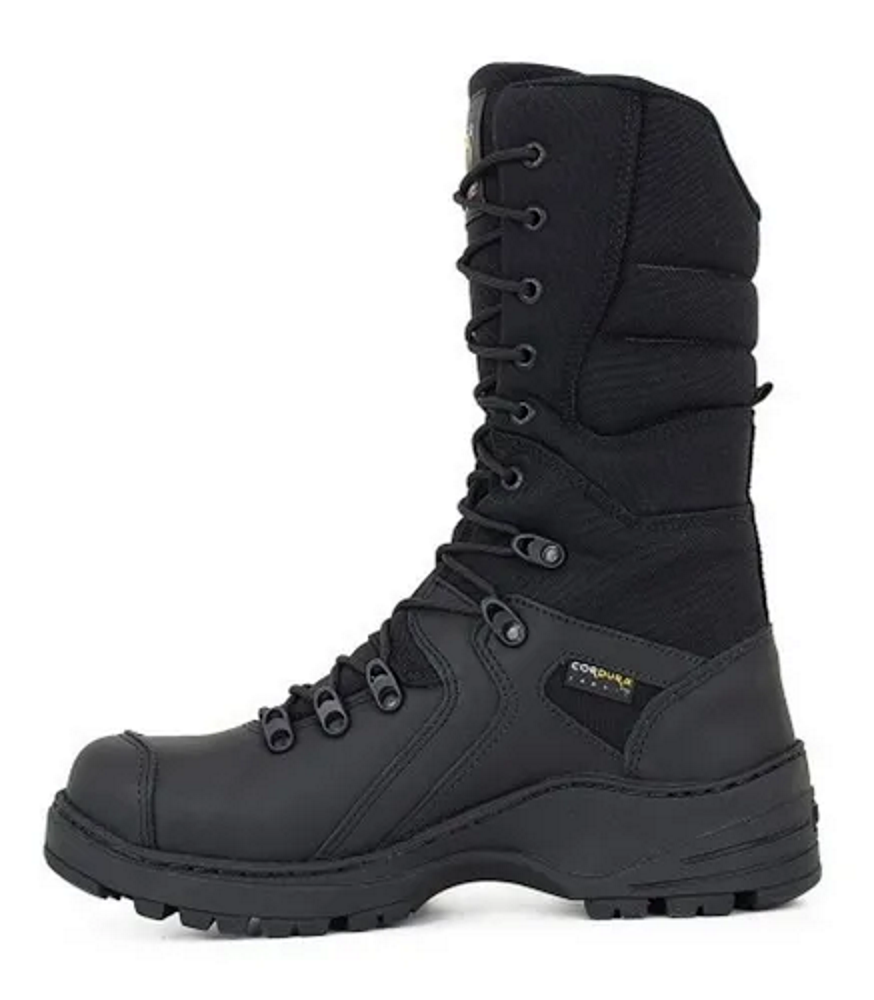 Confeccionada em Couro 2.0mm de espessura, Hidrofugado (repelente a água e sol); Língua, traseira e Cano da Bota em Cordura1000.