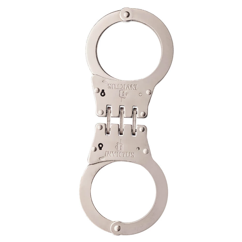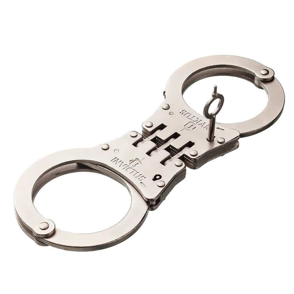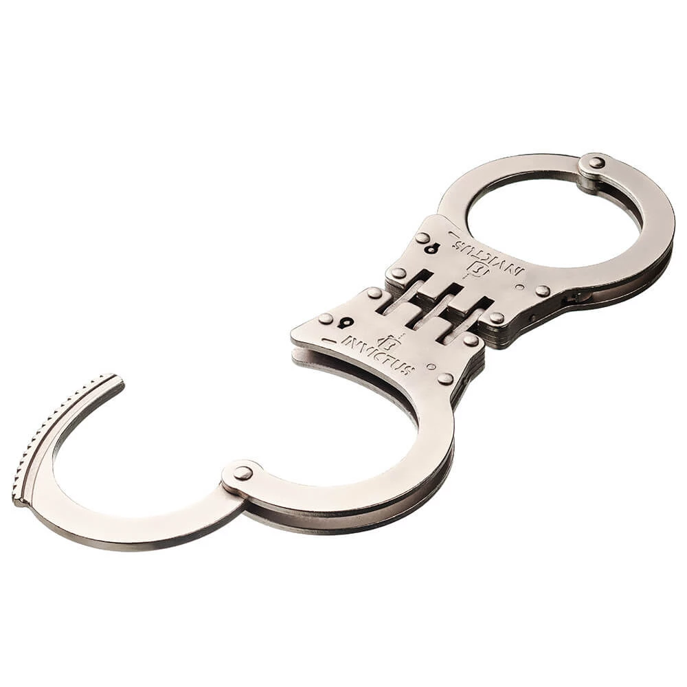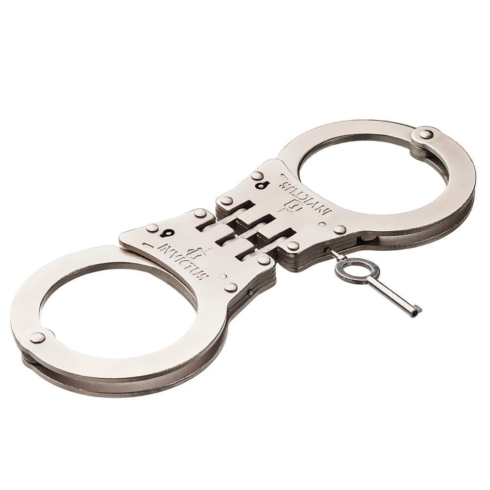 A Algema de Dobradiça Invictus é um modelo de algema de pulso interligada por dobradiça e possui sistema de fechamento dentado através de catracas. O modelo conta ainda com mecanismo de segurança para evitar lesão no uso, acionado pela chave do produto. Fabricada em aço carbono AISI 1020, tem tratamento da superfície niquelado na cor prata, com acabamento fosco para adquirir a característica de antirreflexo. Acompanha duas chaves em aço carbono AISI 1020 na cor da algema.