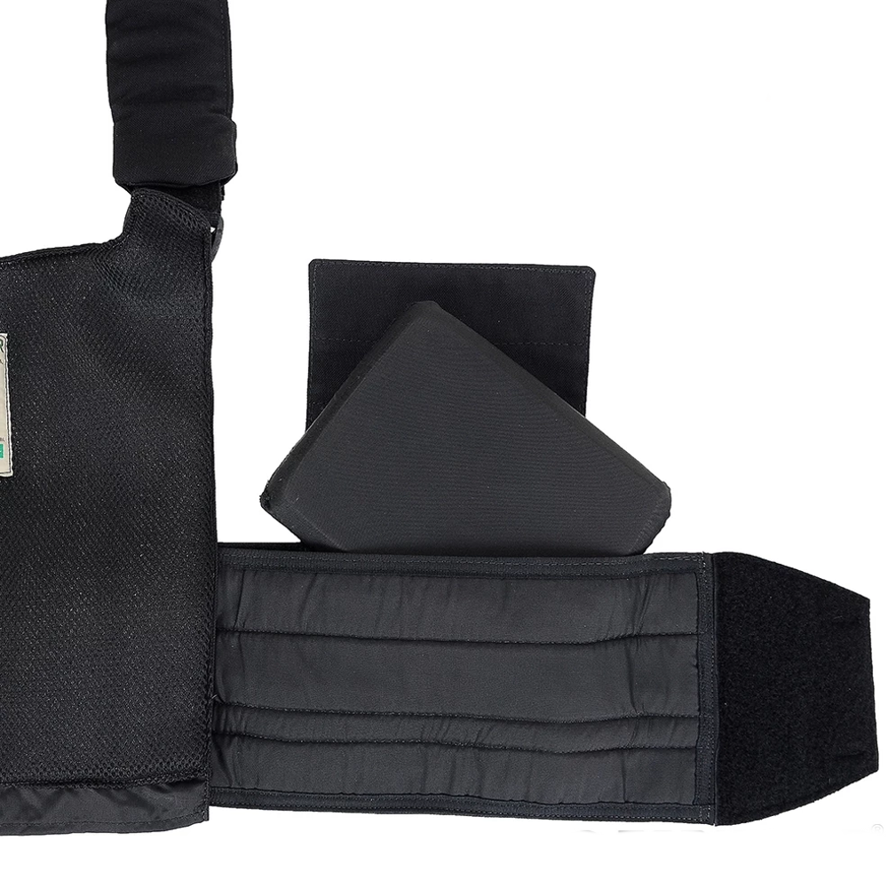 Suas ombreiras possuem alto conforto e permitem distribuição do peso devido sua largura e desenho único com orifício lateral proporcionado melhor ergonomia e permitindo passagem de fios de comunicação por dentro da mesma.