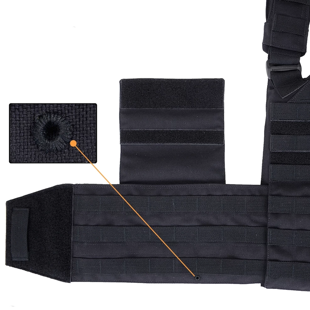 O colete possui orifícios de escoamento de água na parte inferior das abas e no bolso canguru. Isto caso haver queda na água, as placas rígidas com flutuabilidade positiva irão cumprir sua função os orifícios de escoamento irão permitir rápida vazão da possível água acumulada no colete.
