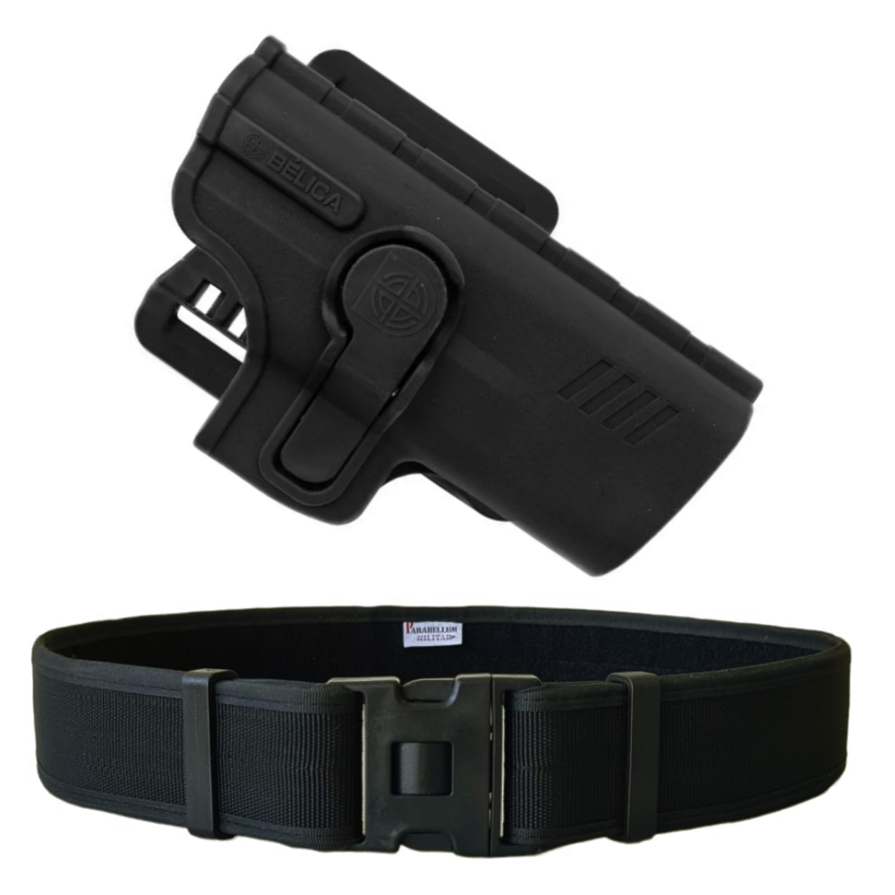 Conjunto guarnição composto por coldre de cintura, porta carregador, porta algema da Bélica Militar e cinto da Parabellum Militar.